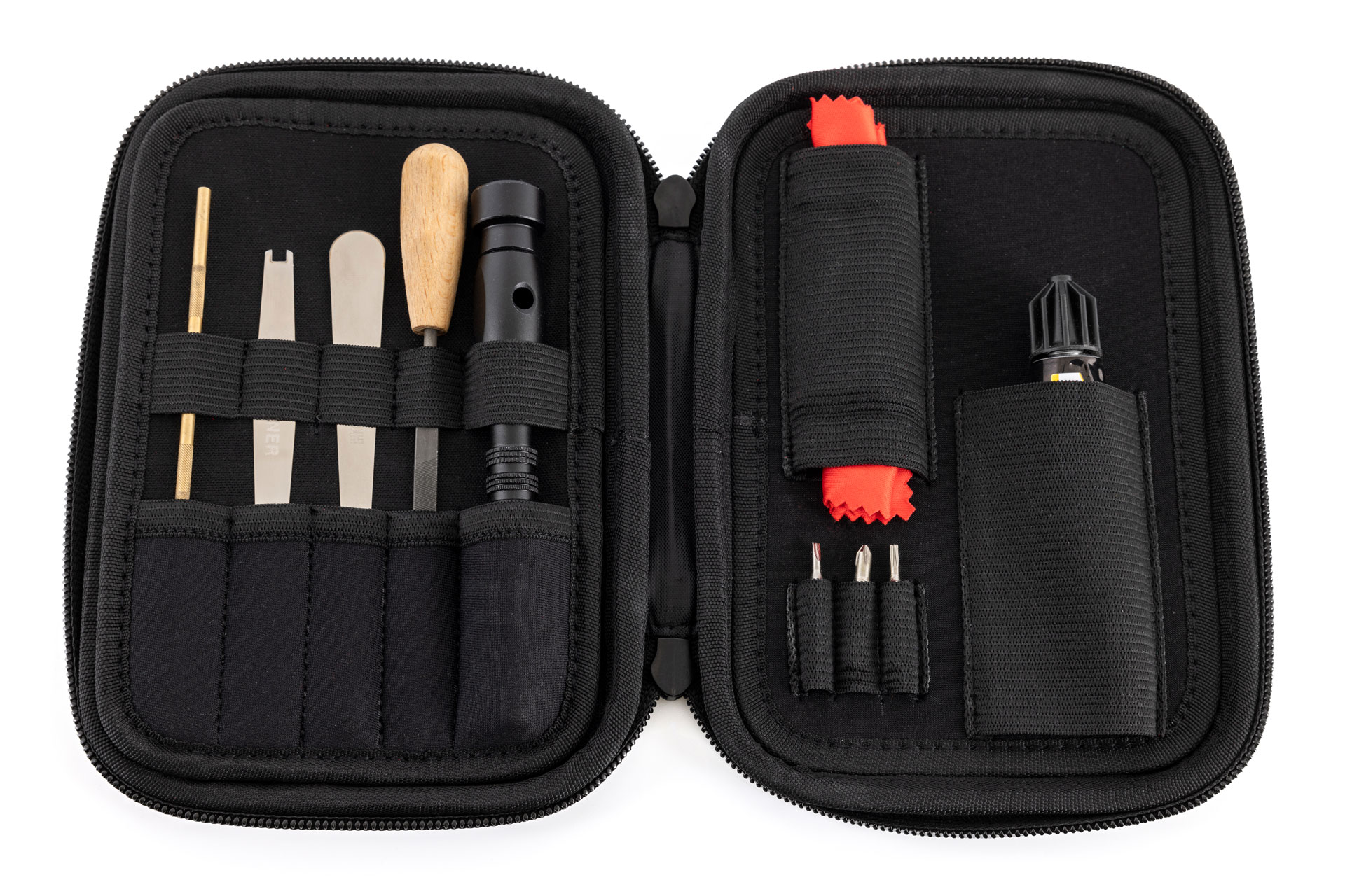 Ce pack contient un grattoir pour les lames, une clé de lame, une lime, un tournevis, une tube de colle pour les valves, un set de valves de remplacement et un chiffon de nettoyage pour l’embouchure et les capots.