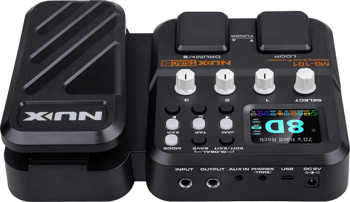 – Multi-effet compact pour guitare : 2 footswitchs, écran couleurs LCD 2,4″, pédale d’expression
