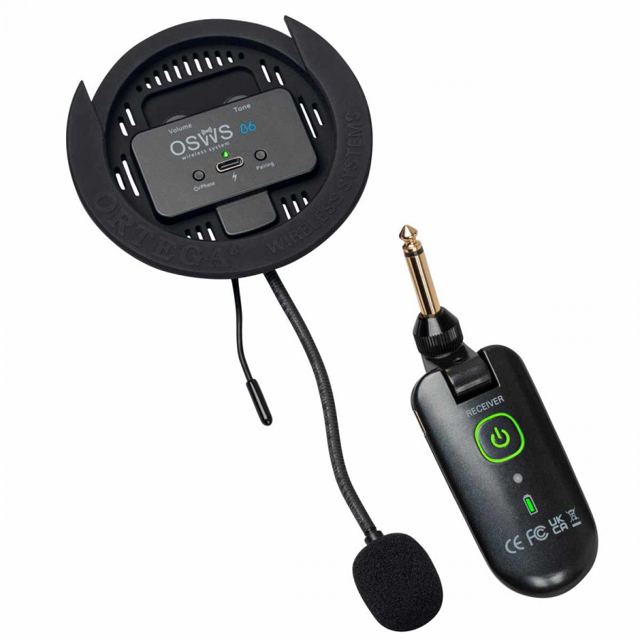 OSWS86, système de micro sans fil pour guitare classique (diamètre de rosace 86 mm), se monte directement dans la rosace de la guitare, aucun perçage ni outil nécessaire, micro sur col de cygne réglable pour un positionnement précis, fonctionne sur 4 canaux UHF, bande sans licence, batterie rechargeable par USB-C, 4 heures de charge pour 8 heures d’autonomie, portée de 30 mètres en espace ouvert, idéal pour les concerts et les répétitions, préserve le son naturel et l’esthétique de la guitare, livré avec câble USB-C et récepteur sans-fil.
